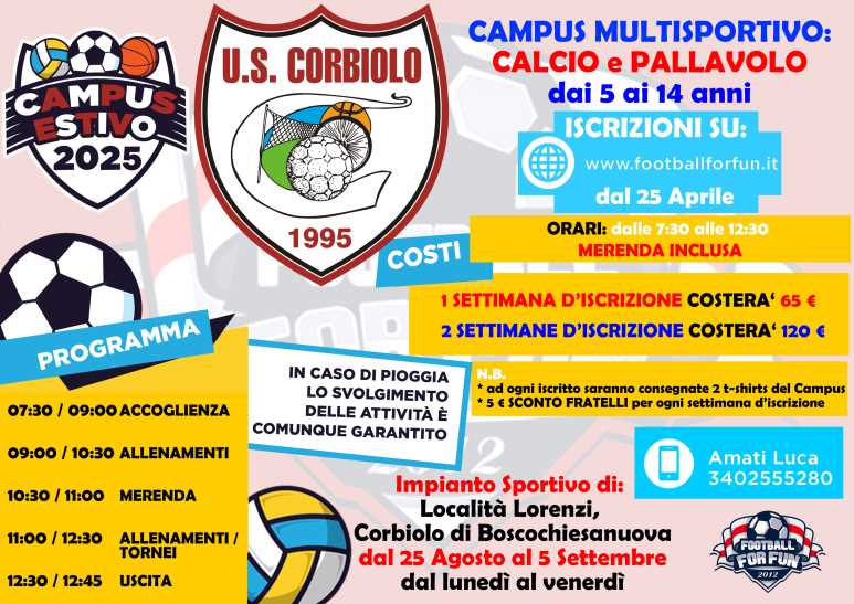 Dopo il successo dell'anno scorso, siamo lieti di presentare per il 2° anno di fila, il Campus Estivo Multisportivo di Corbiolo, dal 25 Agosto al 5 Settembre 2025.