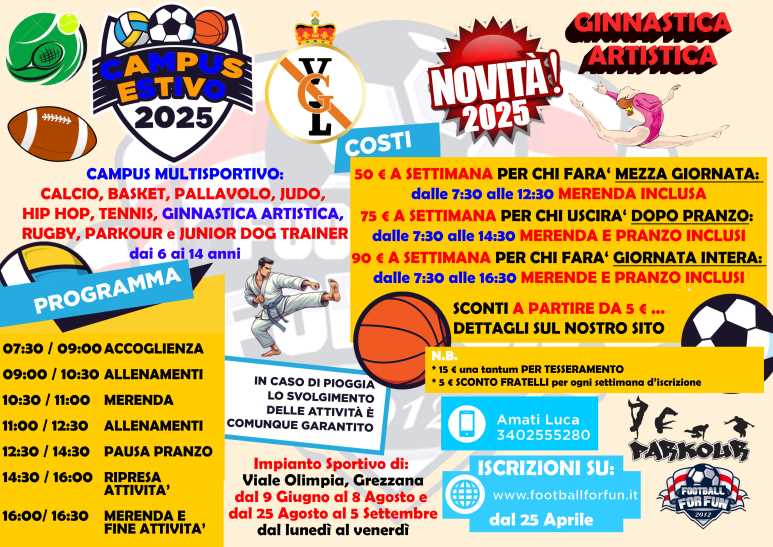 Dopo il successo dell'anno scorso, siamo lieti di presentare per il 17° anno di fila, il Campus Estivo Multisportivo di Grezzana, dal 9 Giugno al 8 Agosto e dal 25 Agosto al 5 Settembre 2025.