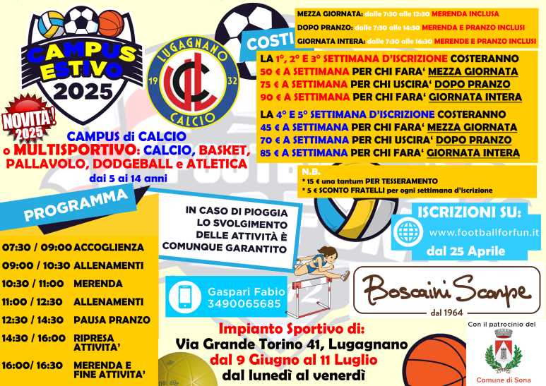 Dopo il successo dell'anno scorso, siamo lieti di presentare per il 13° anno di fila, il Campus Estivo di Calcio e Multisportivo (NOVITA' 2025) di Lugagnano, dal 9 Giugno al 11 Luglio 2025.